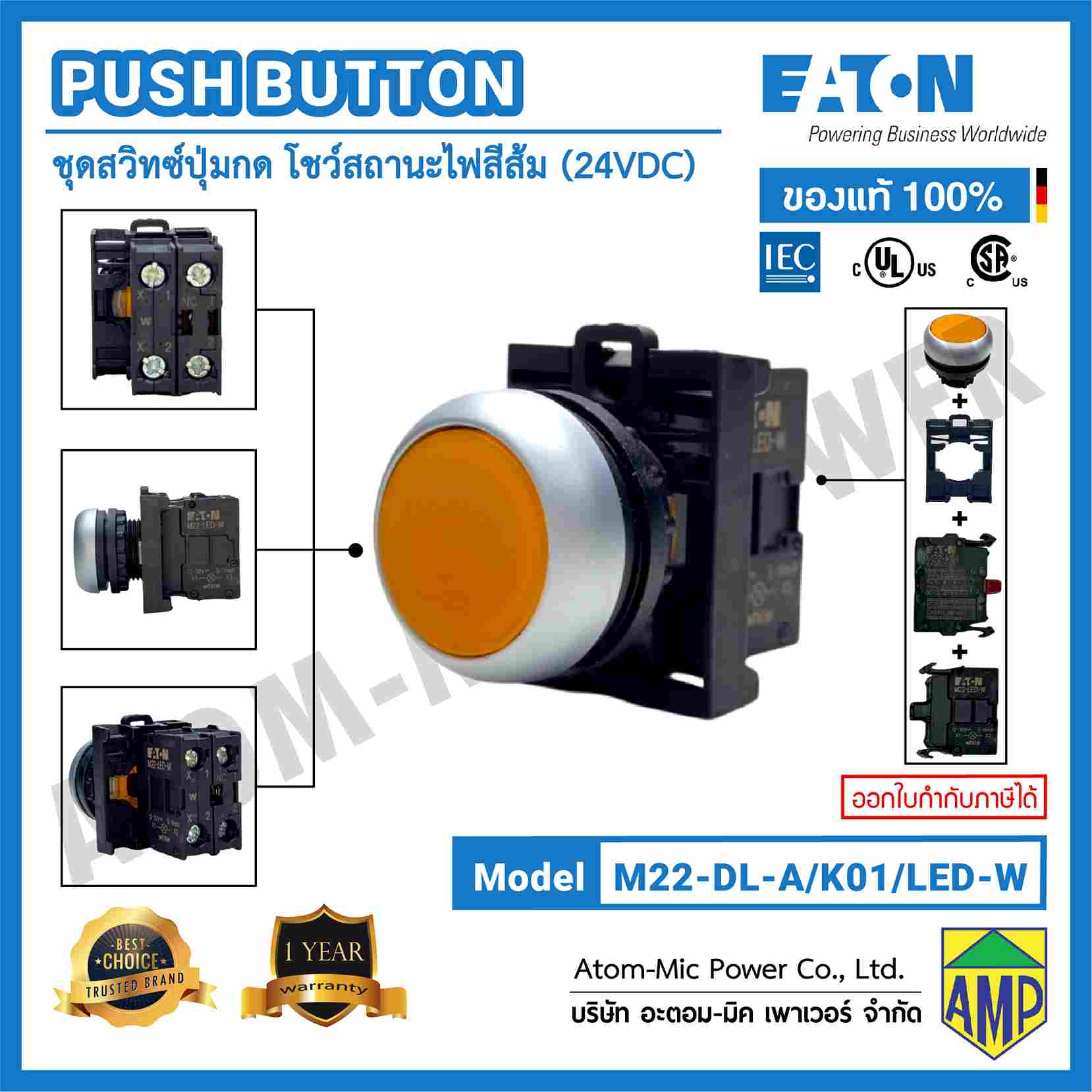 EATON – PUSH BUTTON SWITCH – M22-DL-A/K01/LED-W (1 NC, 24VDC) – ปุ่มกดแล้วเด้งกลับ โชว์สถานะไฟสีส้ม