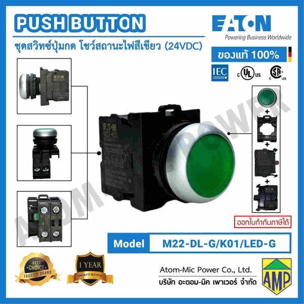 EATON – PUSH BUTTON SWITCH – M22-DL-G/K01/LED-G (1 NC, 24 VDC) – ปุ่มกดแล้วเด้งกลับ โชว์สถานะไฟสีเขียว