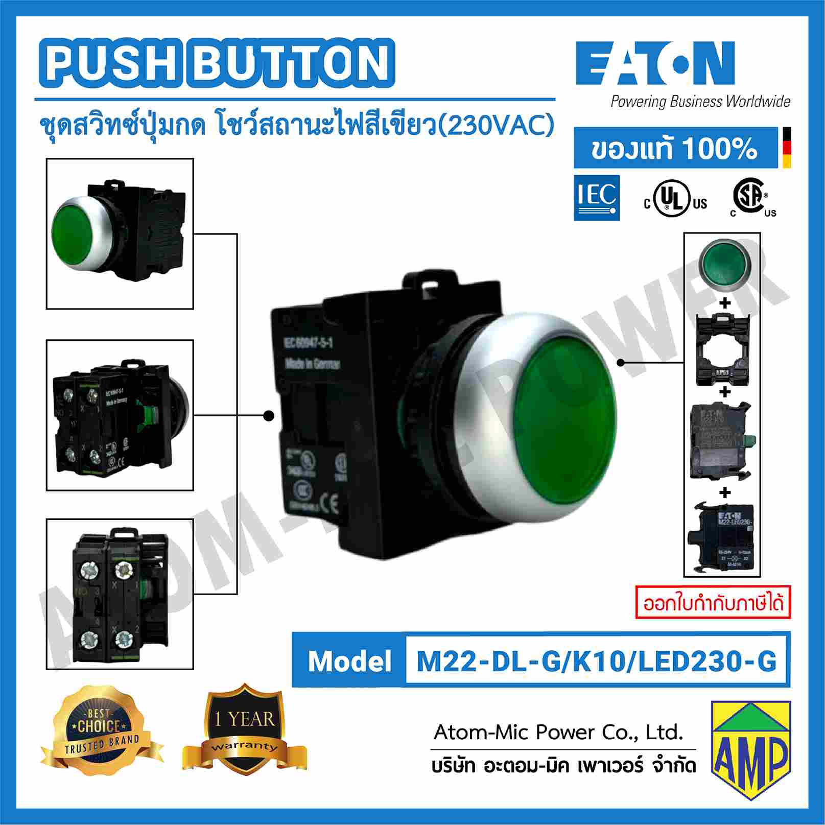 EATON – PUSH BUTTON SWITCH – M22-DL-G/K10/LED230-G (1 NO, 230 VAC) – ปุ่มกดแล้วเด้งกลับ โชว์สถานะไฟสีเขียว