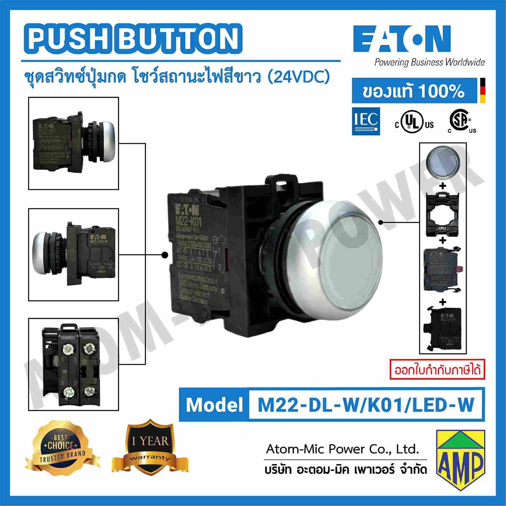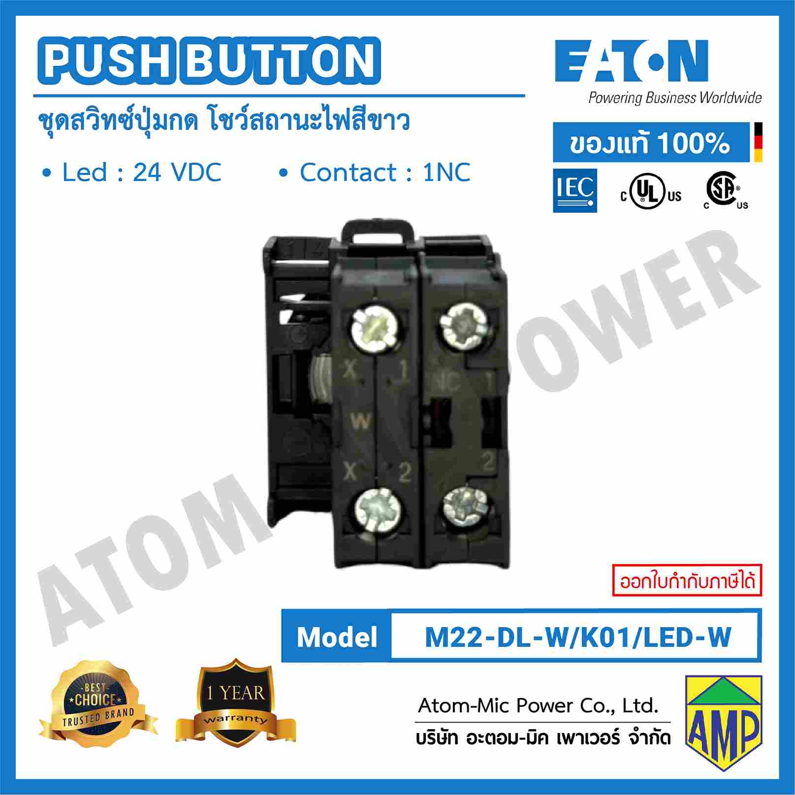 EATON – PUSH BUTTON SWITCH – M22-DL-W/K01/LED-W (1 NC, 24 VDC) – ปุ่มกดแล้วเด้งกลับ โชว์สถานะไฟสีขาว