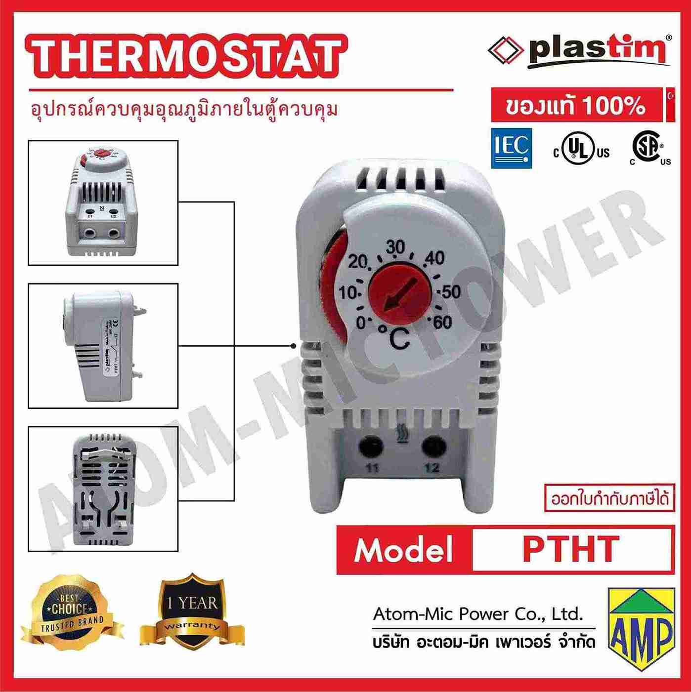 PTHT [ NC contact (Normally close contact)] Thermostat ชนิดนี้ส่วนมากจะใช้ในควบคุมอุณหภูมิภายในตู้ไม่ให้ร้อนเกินไปโดยนำไปต่อกับ Heater โดย Thermostat ชนิดนี้ ส่วนมากจะใช้ติดตั้งภายในตู้ไฟที่อยู่ในพื้นที่อุณภูมิต่ำ เช่น ห้องเย็น