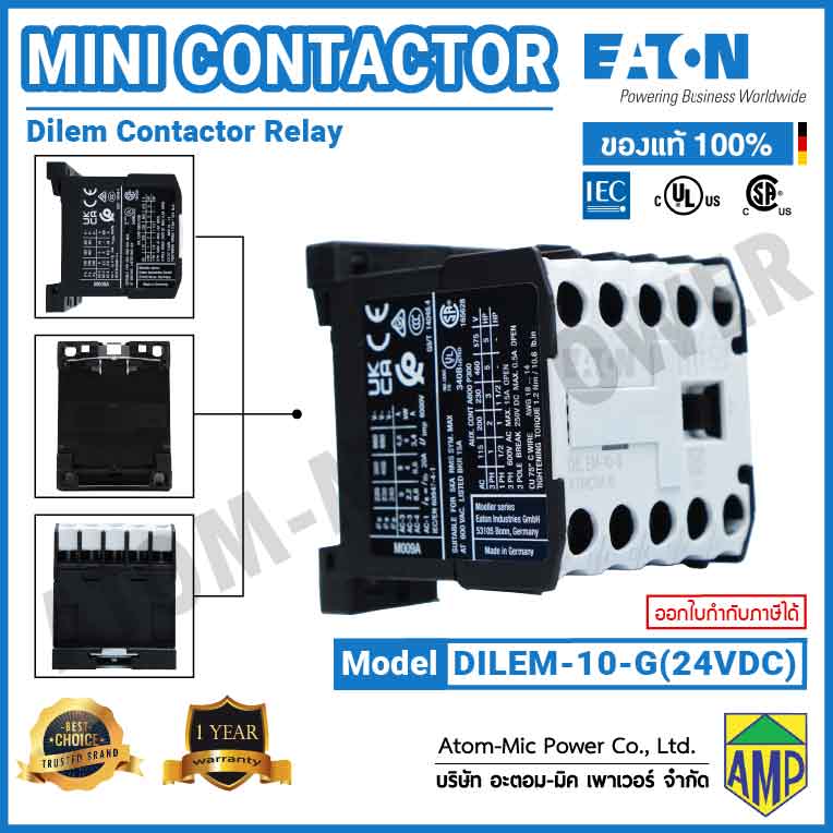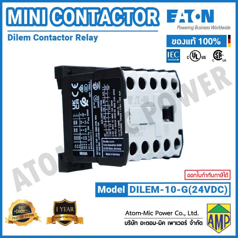 The DILEM-10-G(24VDC) from Eaton Moeller is a three pole mini contactor with normally open (N/O) contacts. DIL E mini contactors are compact, economic and environmentally friendly solution where control of small motors or loads is required. They have higher degree of climatic proofing and large ambient temperature range.