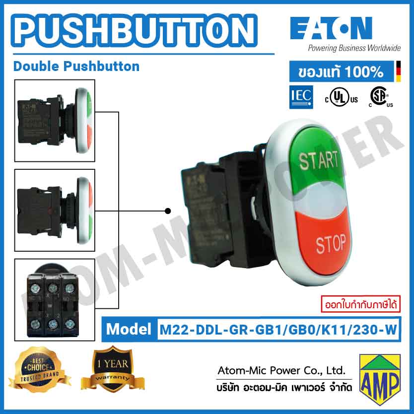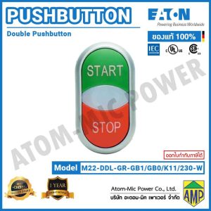 Eaton M22 modular pushbutton, 22.5 mm, Extended, Momentary, Illuminated, Bezel: Silver, Button: Top Green, Bottom Red, Inscription: Top START, Bottom STOP/ GB1, GB2, IP66, NEMA 4X, 13, Light 100,000 hours, LED WHITE 230 V AC