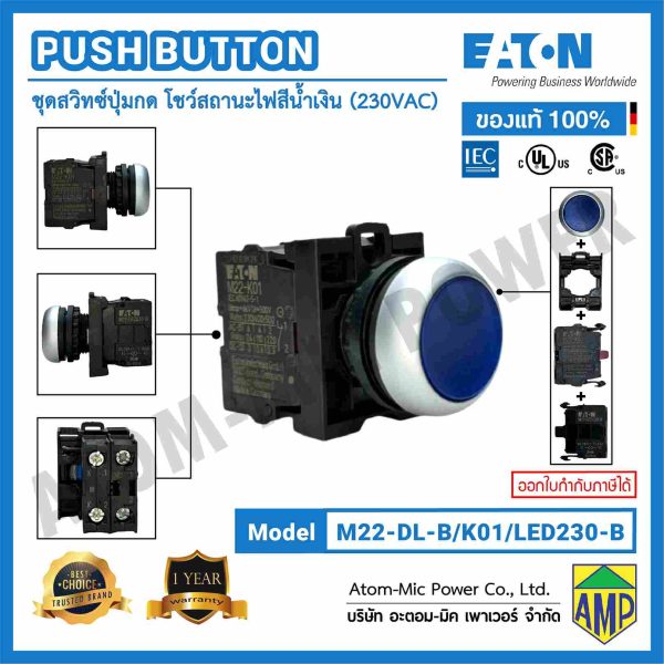 EATON – PUSH BUTTON SWITCH – M22-DL-B/K01/LED230-B (1 NC, 230 VAC) – ปุ่มกดแล้วเด้งกลับ โชว์สถานะไฟสีน้ำเงิน