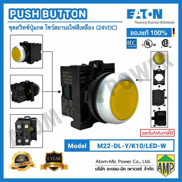 EATON – PUSH BUTTON SWITCH – M22-DL-Y/K10/LED-W (1 NO, 24 VDC) – ปุ่มกดแล้วเด้งกลับ โชว์สถานะไฟสีเหลือง