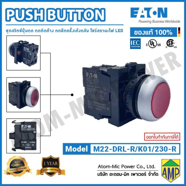 EATON – PUTBUTTON – ชุดสวิทซ์ปุ่มกด กดติดค้าง กดอีกครั้งเด้งกลับ โชว์สถานะไฟ LED – M22-DRL-R/K01/LED230-R (230V AC)